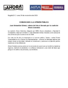 El político caldense Juan Sebastián Gómez será la cabeza de lista al Senado de la República por la Coalición ¡Ahora Colombia! (MIRA, Nuevo Liberalismo, Dignidad y Compromiso).